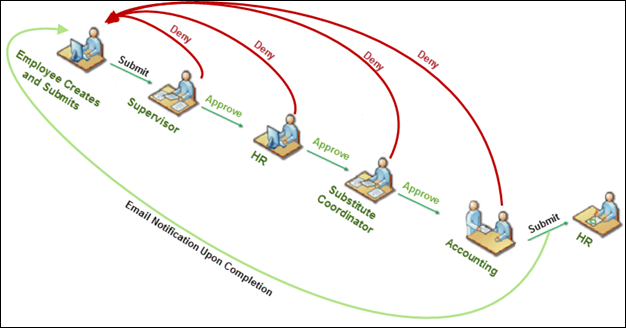 Any DENY sends the form back to the EMPLOYEE who started it.