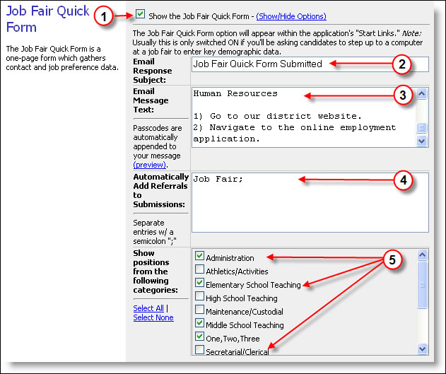 1) The "Show the Job Fair Quick Form" checkbox enables the feature. Click the "Show/Hide Options" link to show or hide the options.