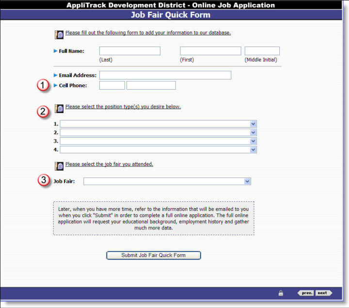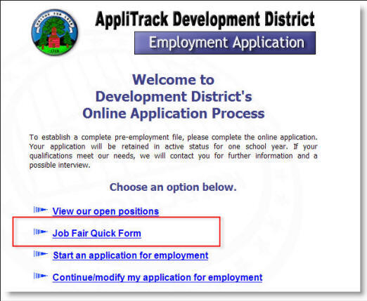 Clicking the "Job Fair Quick Form" link opens the Job Fair Quick Form in a new window.