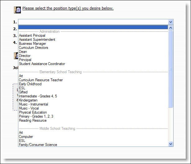 2) The position types available are controlled by the checkbox list in the Show positions from the following categories section of the Job Fair Quick Form Preferences.