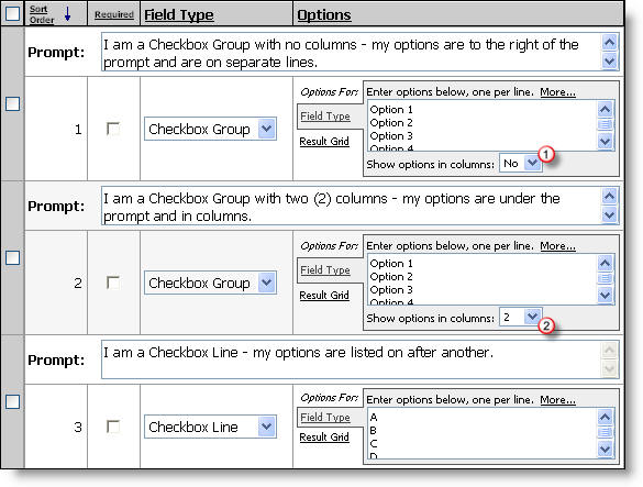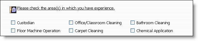 Checkbox Group & Checkbox Line - Use either to supply pre-defined choices for multiple responses. The Checkbox Group is best used when space is not a concern while the Checkbox Line is best used to conserve space and short options.