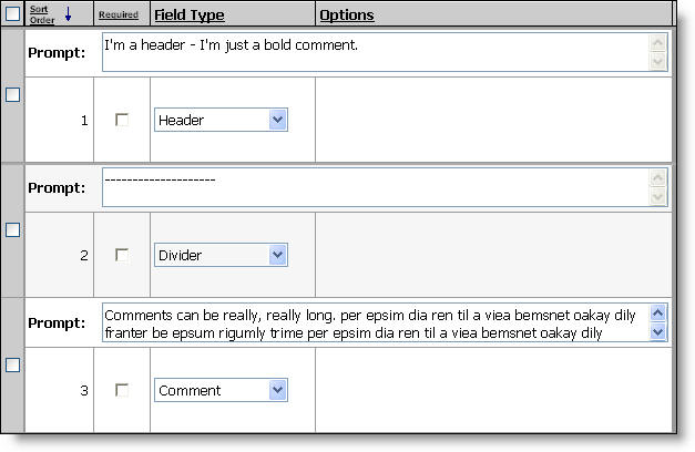A field is an item on a page. Data input fields are a prompt and input area tied together. Comments, Headers and Dividers are fields that improve readability and provide instructions/etc. to applicants. Table start and end fields are placeholders that tell the system to arrange fields in a table layout. Report fields permit the display of complex inforamtion from other data sources on the surface of the form or page. Grouping fields are not displayed on the form at all, but instead create columns for administrators when they are viewing lists of applicants. The most commonly used field types collect information on the form/page and have a specific format as described in this document. Possible input types are:The Field Type is specified by selecting an option from the Field Type drop-down list on the Form Designer.
