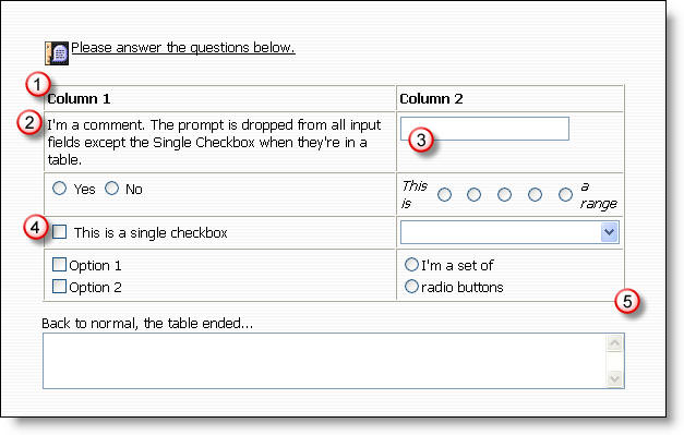 Tables - Fields can be placed in a table to improve layout when necessary. Fields "flow" right to left and new lines are created automatically to match the number of columns specified. In the screenshot below, there are two columns. Prompts are dropped from all input fields except the Single Checkbox when they're in a table.