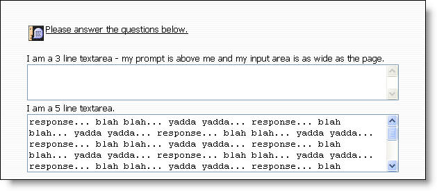 Textarea - Use a textarea for questions with a lengthy response. Textareas can be any amount of Lines High. Responses are not limited to the height of the textarea because it will scroll to accommodate unlimited text. It is recommended that you limit your Lines High to 10 or less so the applicant doesn't have the scrollbar inside a scrollbar effect.