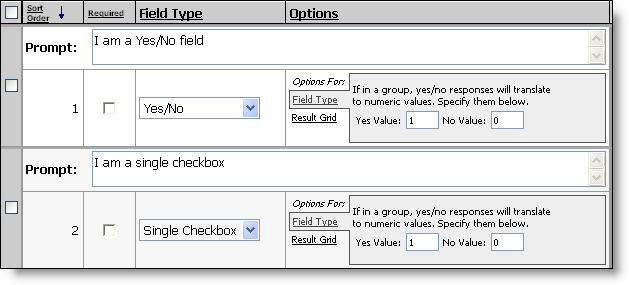 Yes/No & Single Checkbox - Use either for Yes/No questions. Besides the obvious input area difference, the fields work differently when they are marked as required. A Single Checkbox forces the applicant to click Yes before proceeding while the Yes/No field allows them to select either.