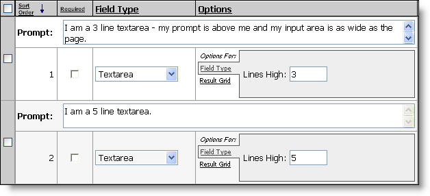 Textarea - Use a textarea for questions with a lengthy response. Textareas can be any amount of Lines High. Responses are not limited to the height of the textarea because it will scroll to accommodate unlimited text. It is recommended that you limit your Lines High to 10 or less so the applicant doesn't have the scrollbar inside a scrollbar effect.