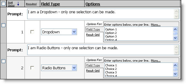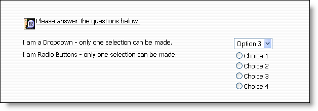 Dropdown & Radio Buttons - Use either to supply pre-defined choices for a single response. The Dropdown is best used with more than 2 options and the Radio Buttons are best used with less than 5 options.