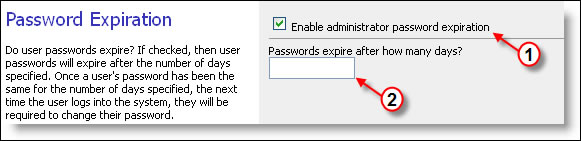 1) To specify a password expiration period, click in the check box next to Enable administrator password expiration.
