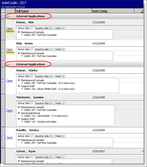 Once submitted to AppliTrack, internal applicants appear much same way as external applicants. When an internal application is submitted it is tagged with the word "internal" for easy identification as in the following image.
