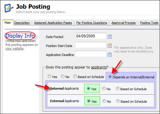 Use the new Depends on Internal/External option when Internal and External applicants will have different time frames to view and apply for the position. The Internal and External sections control the appearance of the posting to internal and external applicants of their respectively.